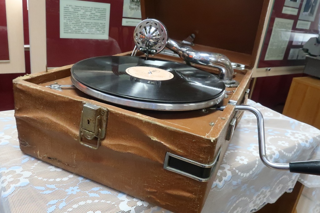 В музее представлен патефон, изготовленный на Госзаводе Министерства сельхозмашиностроения СССР в г. Молотове (ныне – Пермь) в 1950-е гг. Патефон находится в рабочем состоянии.