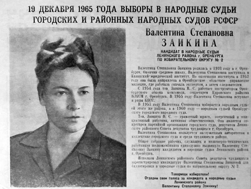 С трудом передвигаясь по комнате, Валентина Степановна достает небольшую папку. В ней - фотографии, поздравительные открытки, благодарственные письма – самое ценное, что осталось с тех непростых и активных лет. Очень бережно и, явно волнуясь, пожилая женщина достает фотографию. Рядом с фотографией оказывается газетная заметка, на ней фотография красивой женщины и статья под названием «19 декабря 1965 года выборы в народные судьи городских и районных народных судов РСФСР. Валентина Степановна Заикина, кандидат в народные судьи Ленинского района г. Оренбурга по избирательному округу № 2».